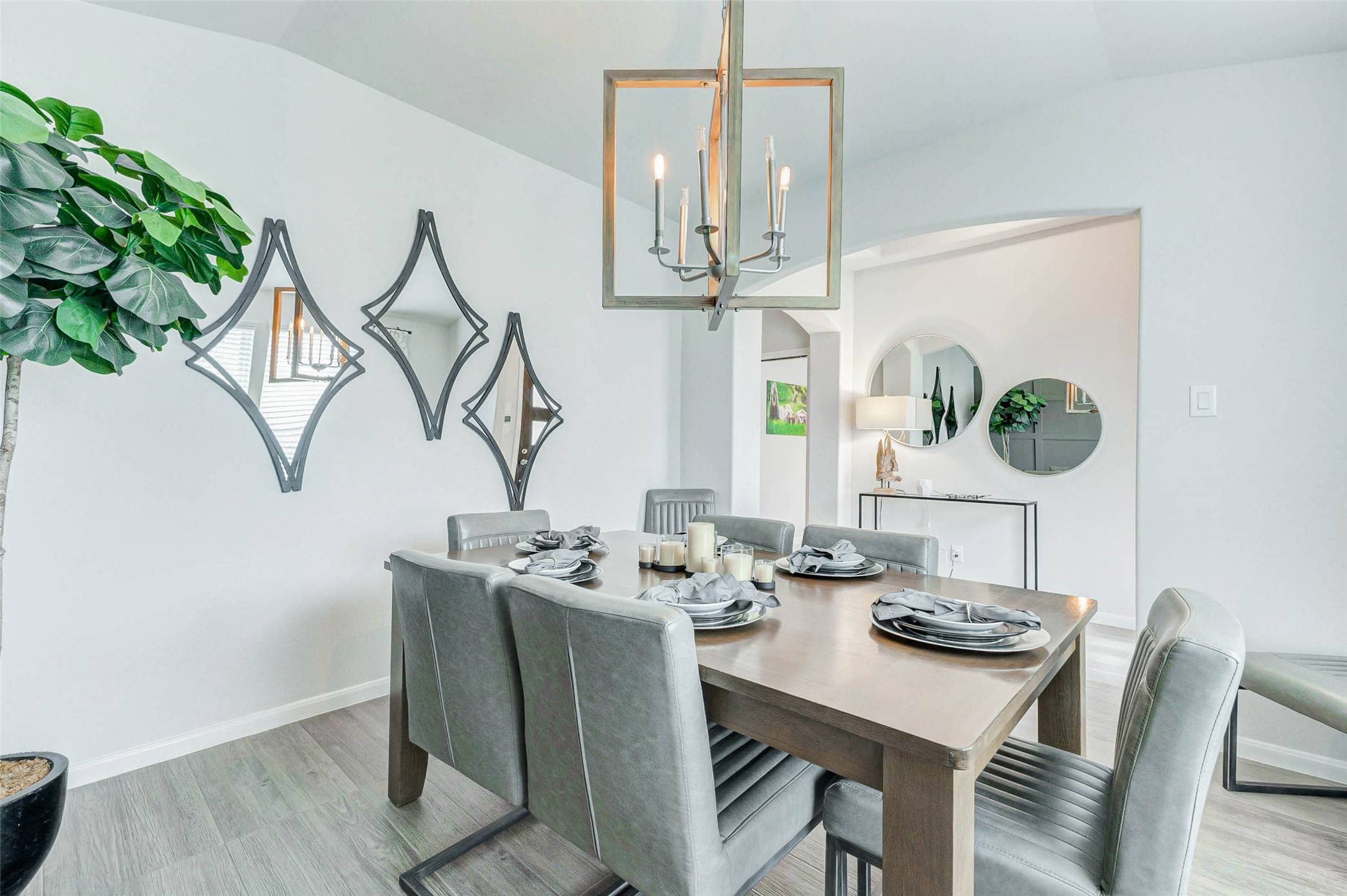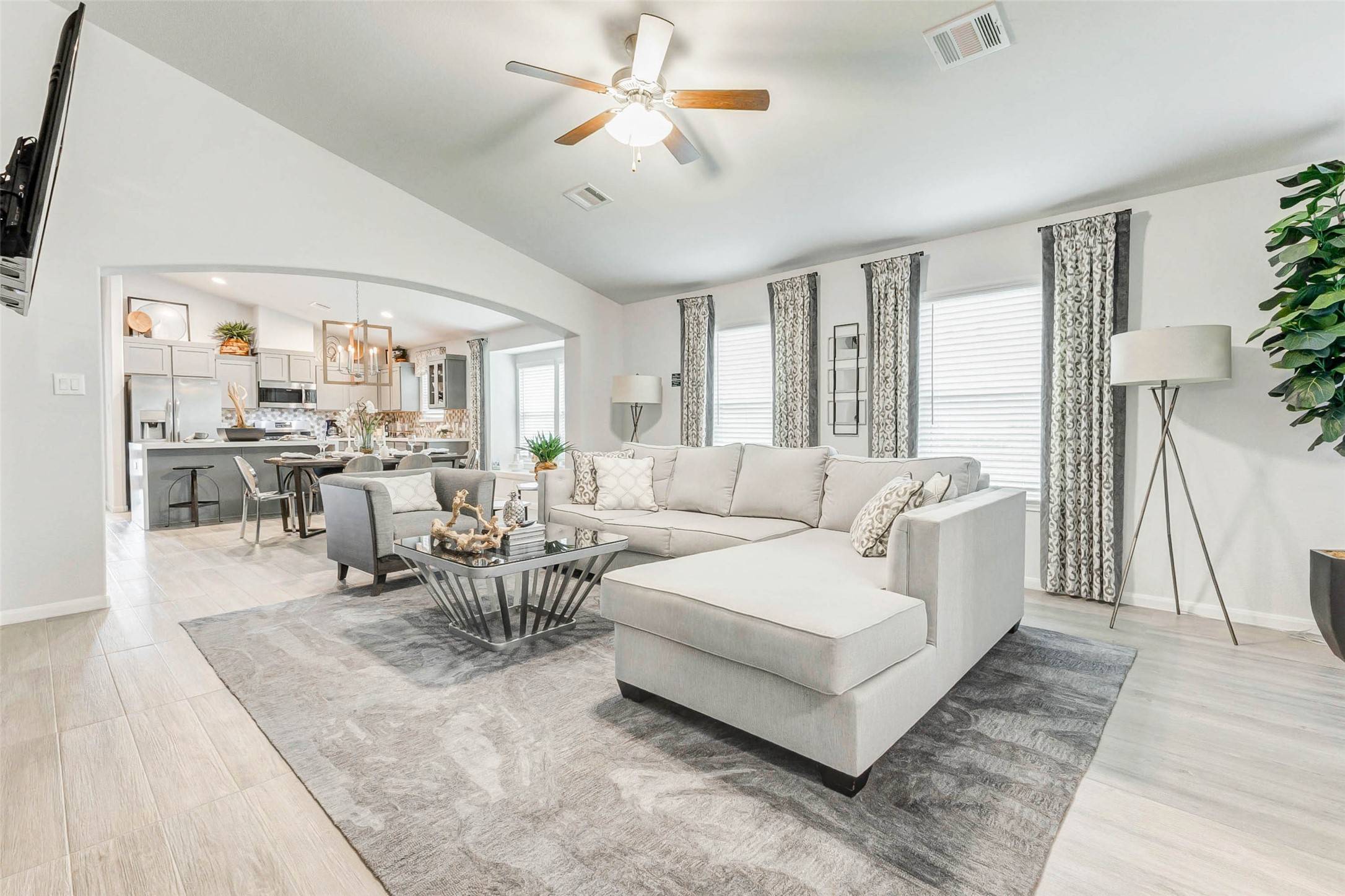 Welcome to 34 Rodeo Dr in the desirable Rodeo Palms community. This beautifully maintained 3 bed, 2 bath traditional home offers 2,056 SF of thoughtfully designed space on a 7,388 SF lot. Built with brick and stone on the front elevation and cement board siding in the rear, this home blends curb appeal with lasting durability. Inside, enjoy soaring ceilings, recessed lighting, and wood look tile flooring. The open concept kitchen features a large island, backsplash, pantry, and breakfast bar. The living room with fireplace flows into a formal dining space, perfect for entertaining. The primary ensuite offers a soaking tub, separate shower, double vanity, and walk in closet. Energy features include a digital programmable thermostat and efficient design. Additional perks: auto garage door opener, flexible home office space, fully fenced backyard, and covered patio. Minutes from shopping, schools, dining, and major routes. A fantastic opportunity in Manvel!